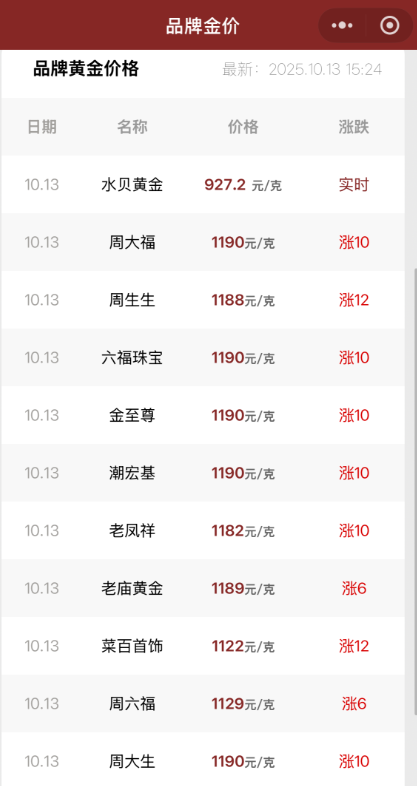 受国际金价影响,国内金店金饰克价突破1190元。据今日金价小程序,周大福金价由前一日的1180元/克上调至1190元/克;周生生金价由前一日的1176元/克上调至1188元/克;老庙黄金金价由前一日的1183元/克上调至1189元/克。